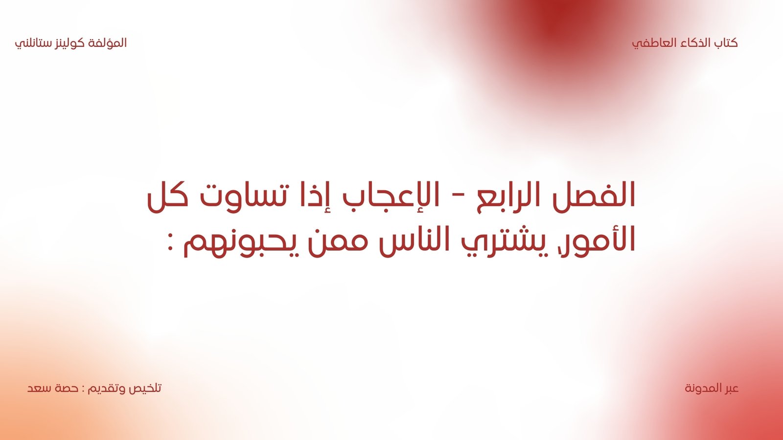 ثم تُشدد على فكرة صفات الأذكياء عاطفيًا. يعرفون كيف يتصرفون مع مشاعرهم. يحسنون صنع قراراتهم. لديهم القدرة على العمل والتنفيذ. ولديهم مهارة عالية في ضبط النفس وهي مهمة جدًا في التعامل مع العملاء. لديهم وعي ذاتي وفي كل مرحلة يحاولون التطوير من أنفسهم. وأيضًا ميزتهم لأنهم أشخاص جيدون يفضلون التواجد مع أشخاص جيدين آخرين.